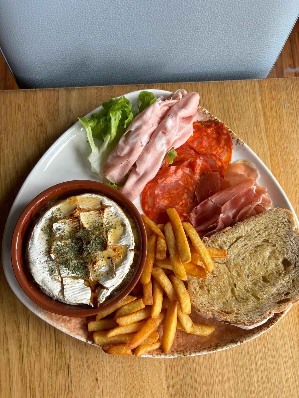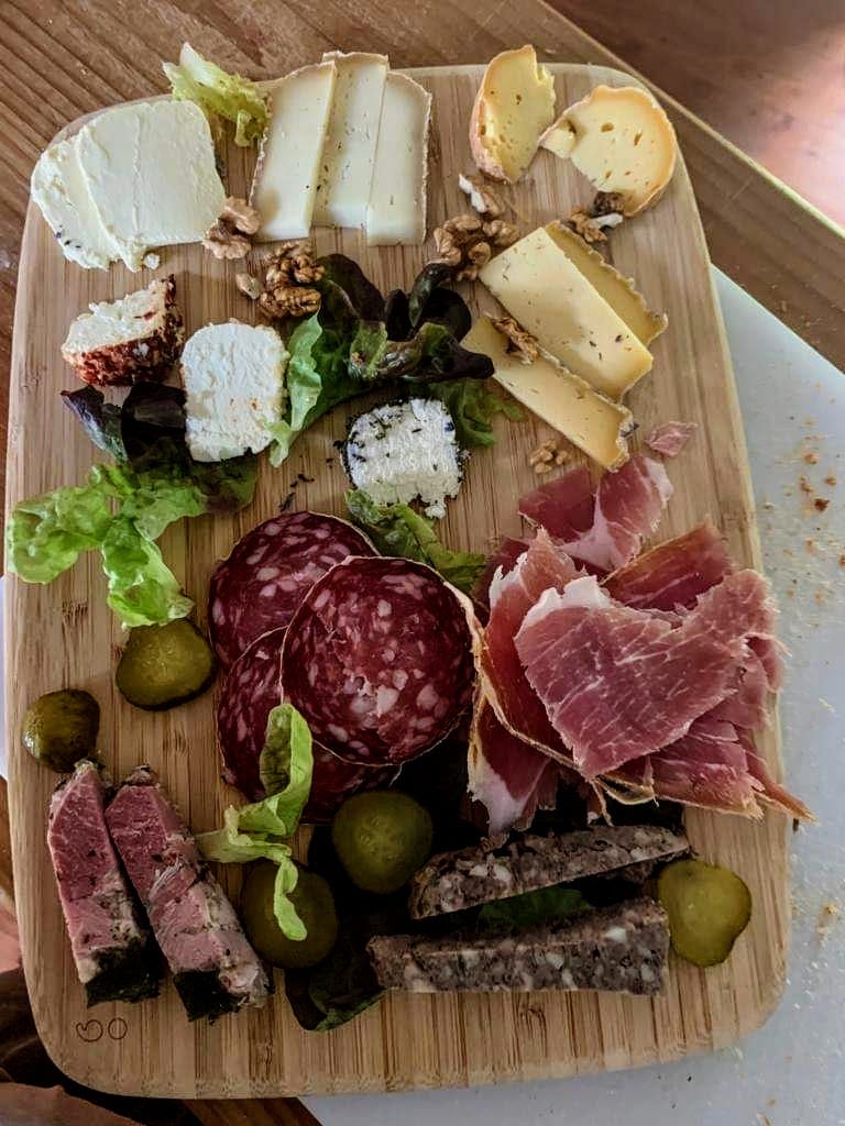 La planche de charcuterie et fromage, plutôt sympa mais il faudrait éviter de couper les tranches de saucissons et de chorizo trop en avance. Elles ruissellaient de gras. Certes, il faisait très chaud mais servir ainsi n'est pas forcément super ! Les serveurs étaient débordés, manque de personnel !