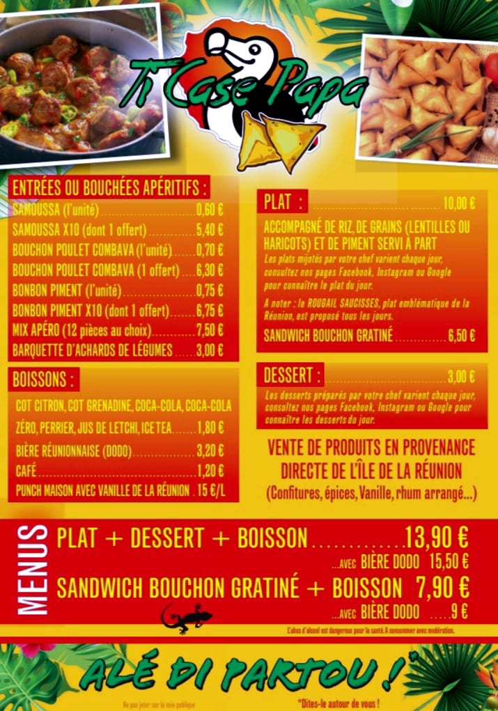 snack de spécialités réunionnaises, à emporter ou sur place, plat cuisinés maison... et coin boutique de produits de la Réunion.